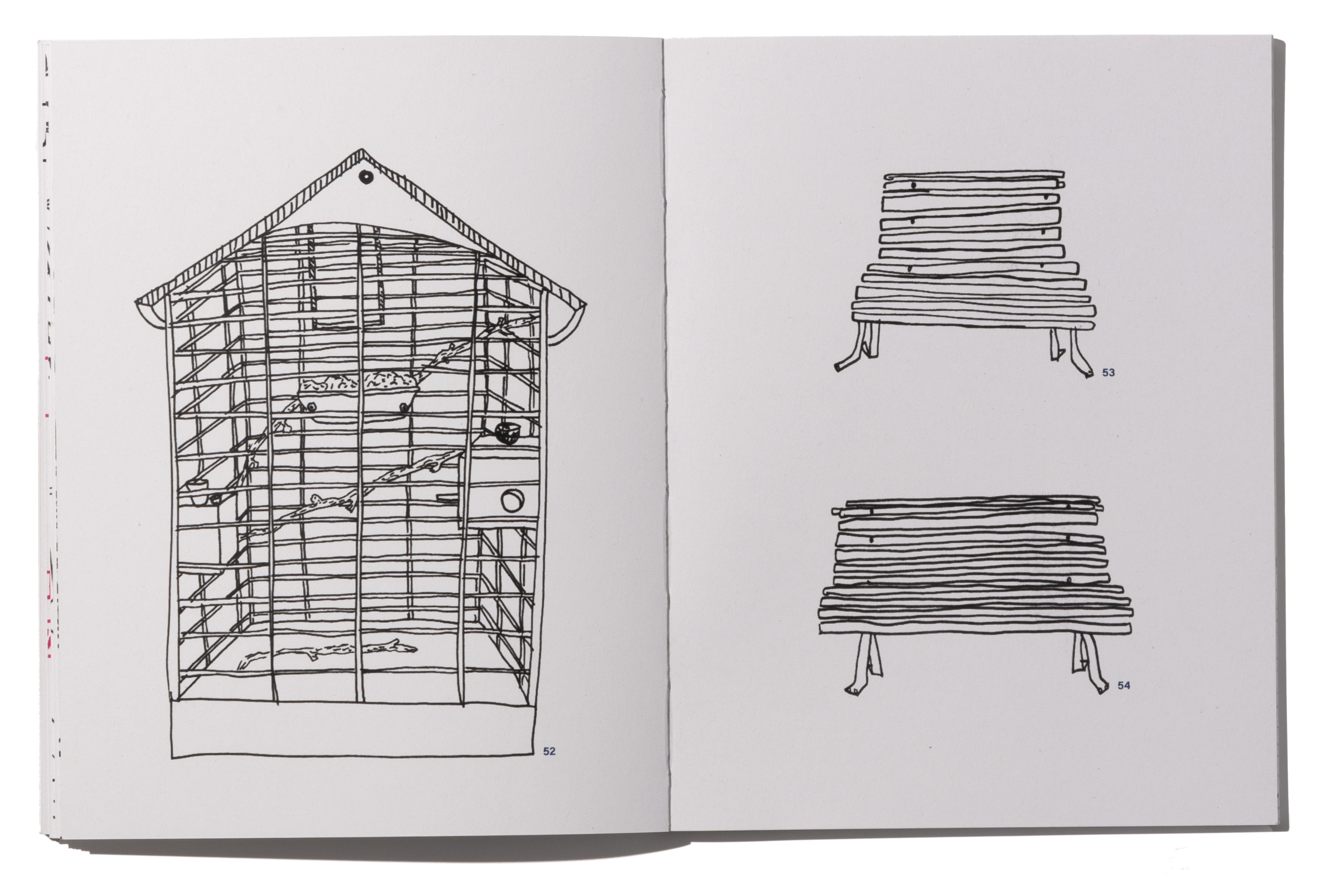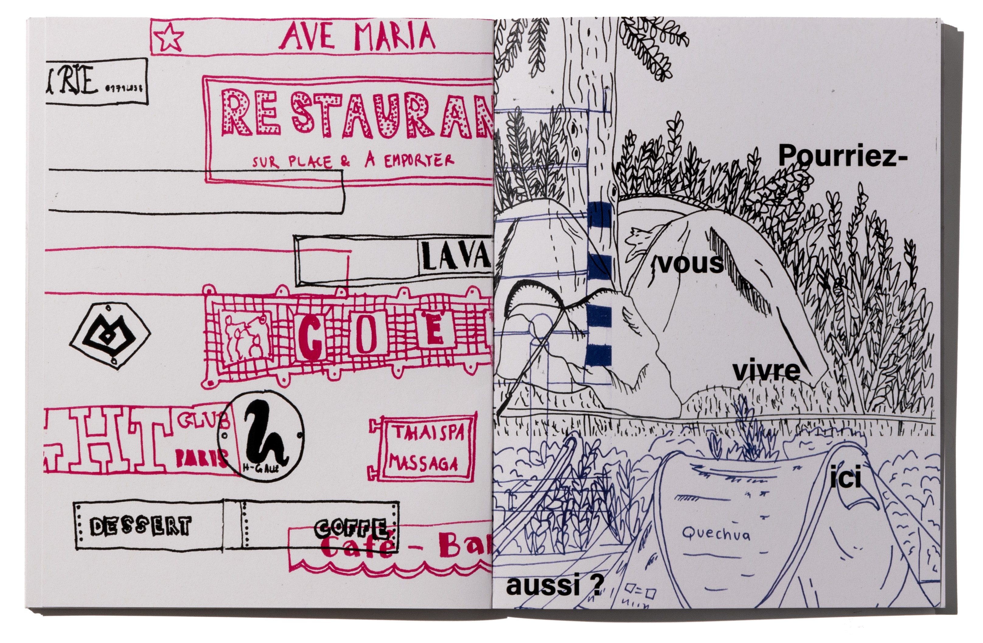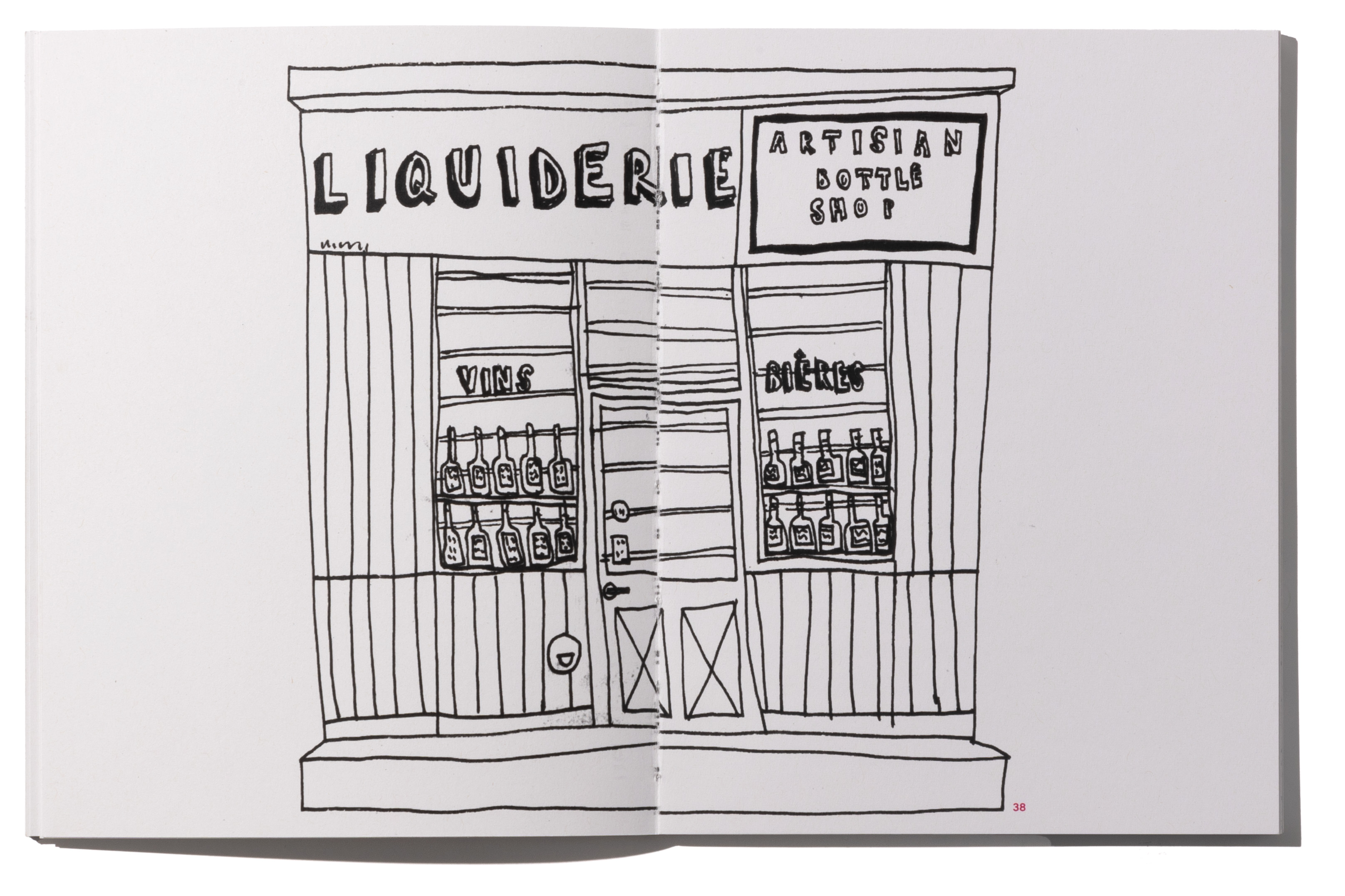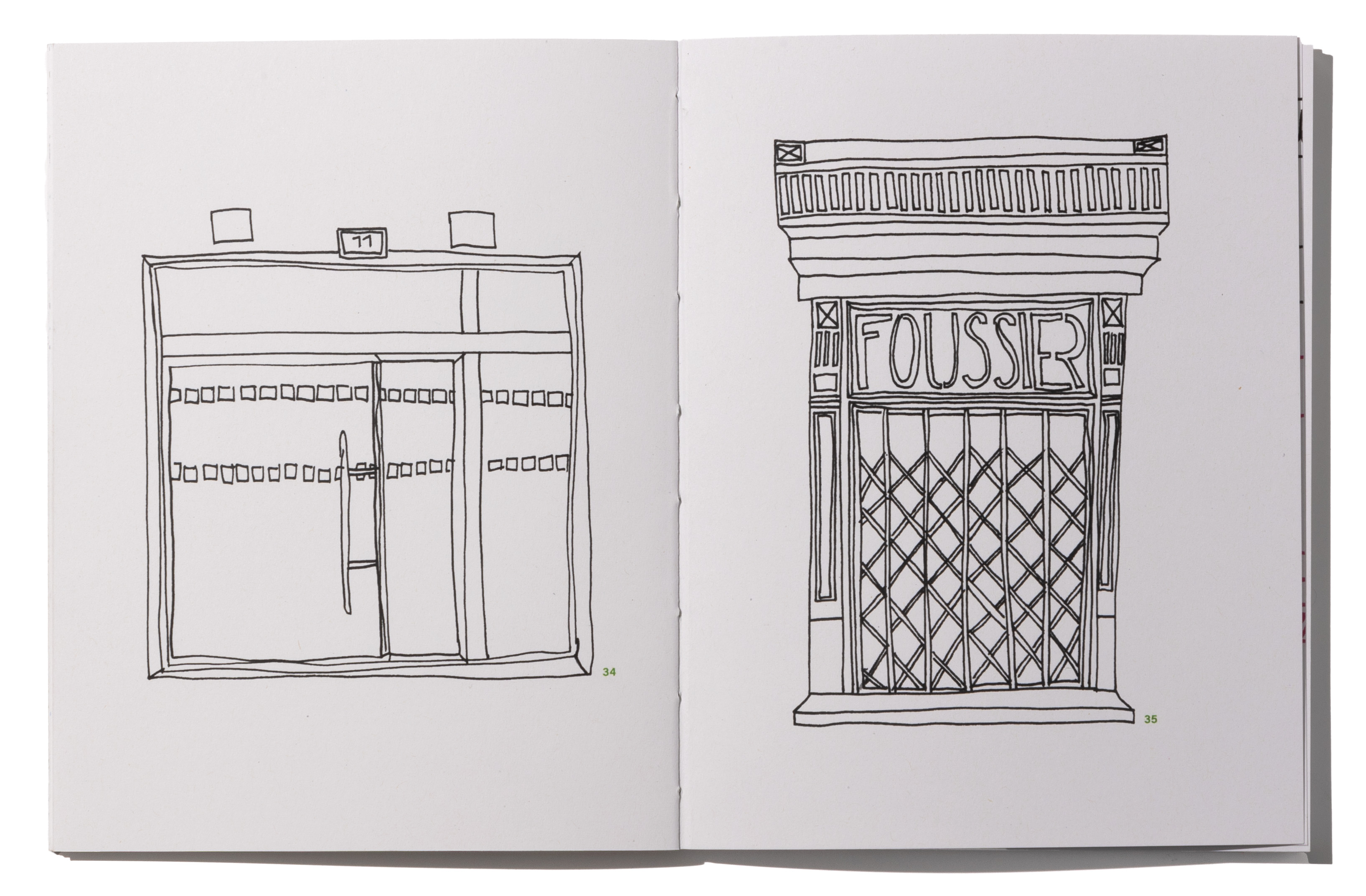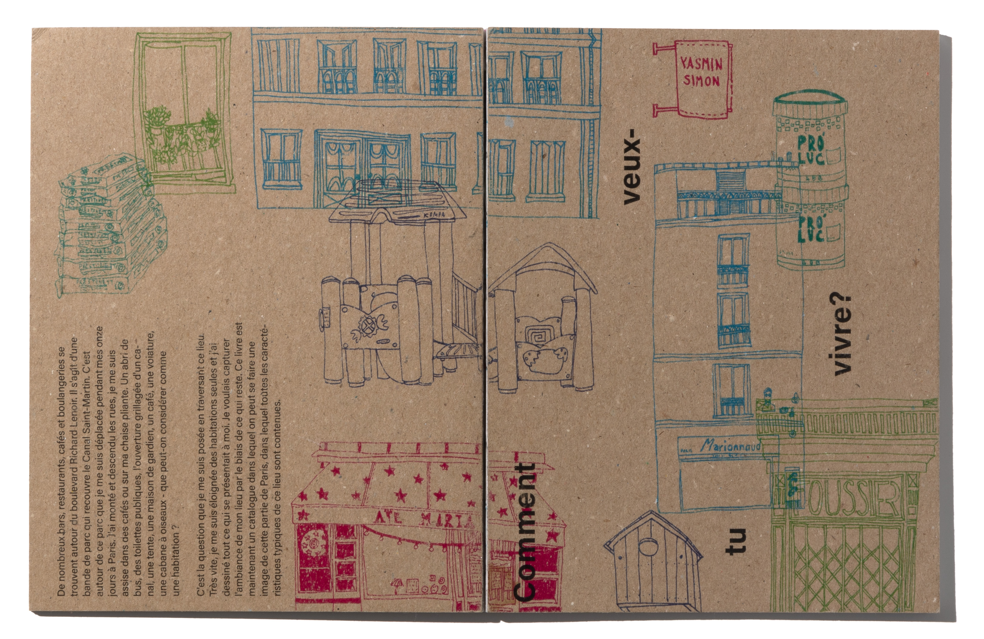Mit dem Quartier um den Canal Saint Martin habe ich mich während meiner Zeit in Paris beschäftigt. Was macht dieses Quartier aus, wie ist die Architektur, wo geht man Essen, wo wohnt man? Zeichnerisch und illustrativ habe ich mich damit auseinandergesetzt. Ich habe mit Fineliner direkt und ohne vorzeichnen, mit viel Mut, in mein Skizzenbuch gezeichnet. Die vielen Zeichnungen habe ich dann in mehreren Kategorien geordnet. Jede Kategorie wurde zu einem Kapitel, zum Beispiel Fenster und Türen oder Geschäfte. Alle Kapitel haben eine Farbe zugeteilt, die sie markiert und die als Leitfaden dient. Dies ist sichtbar am offenen Rücken des von mir selbst gebundenen Buches.