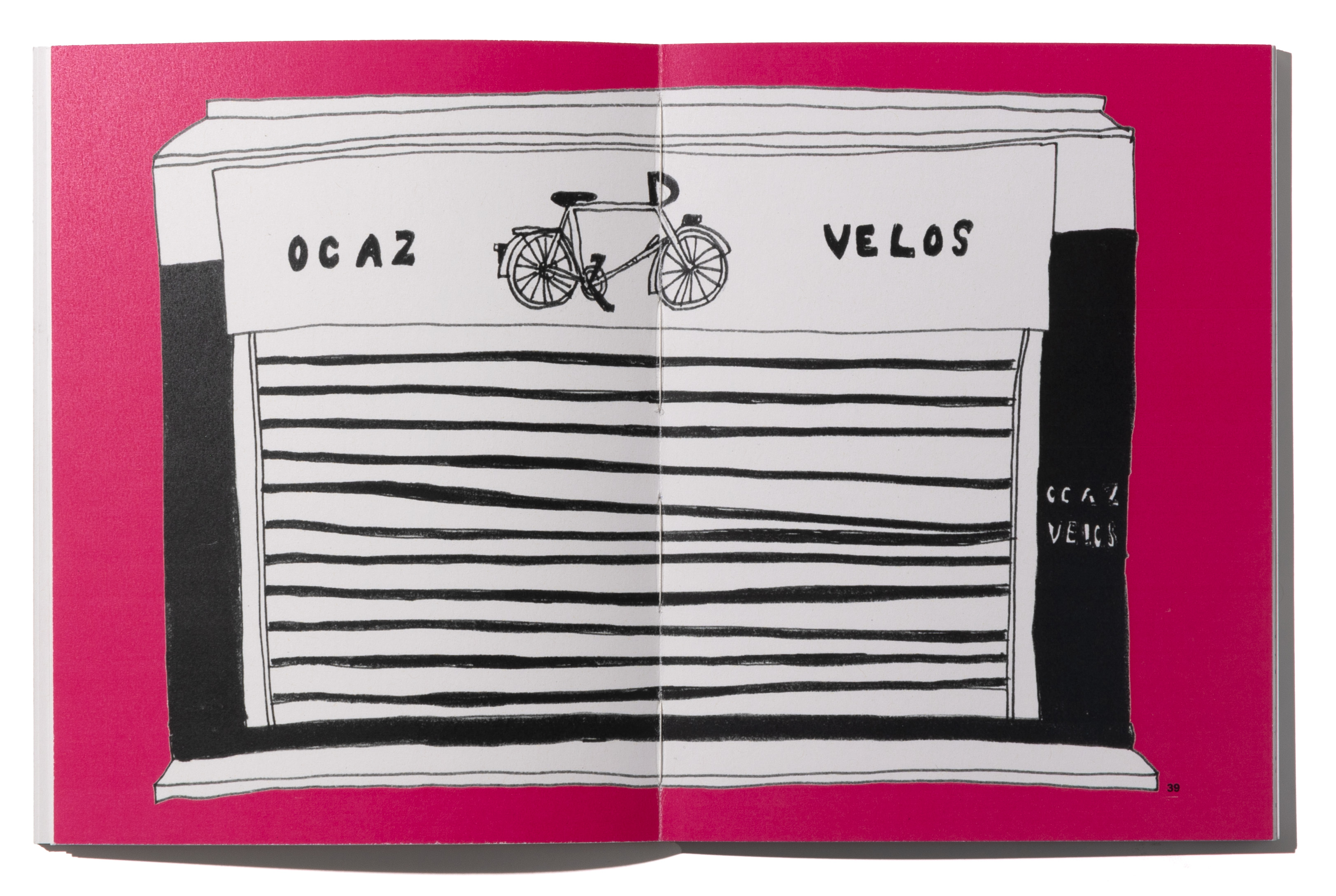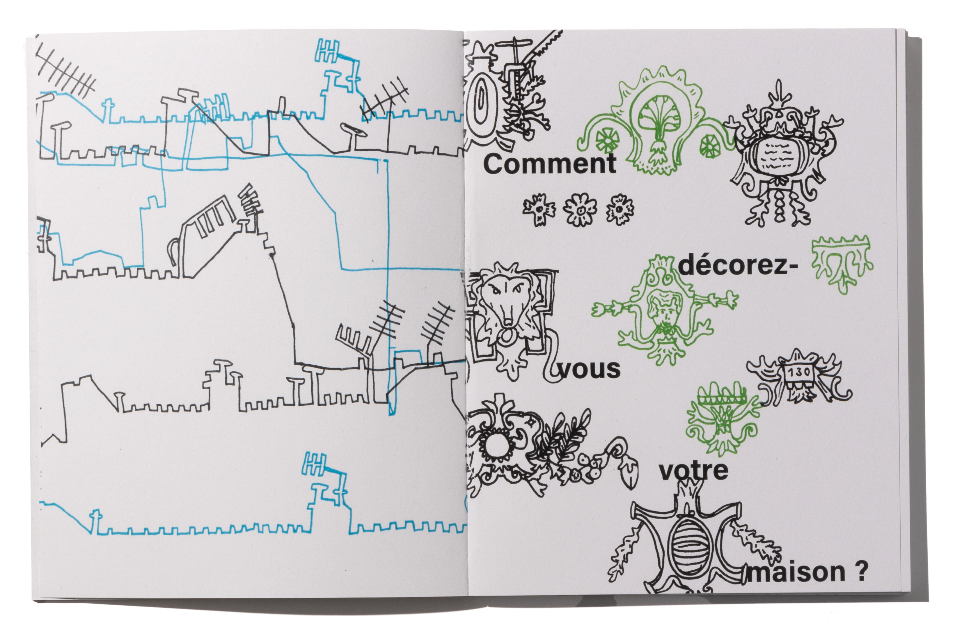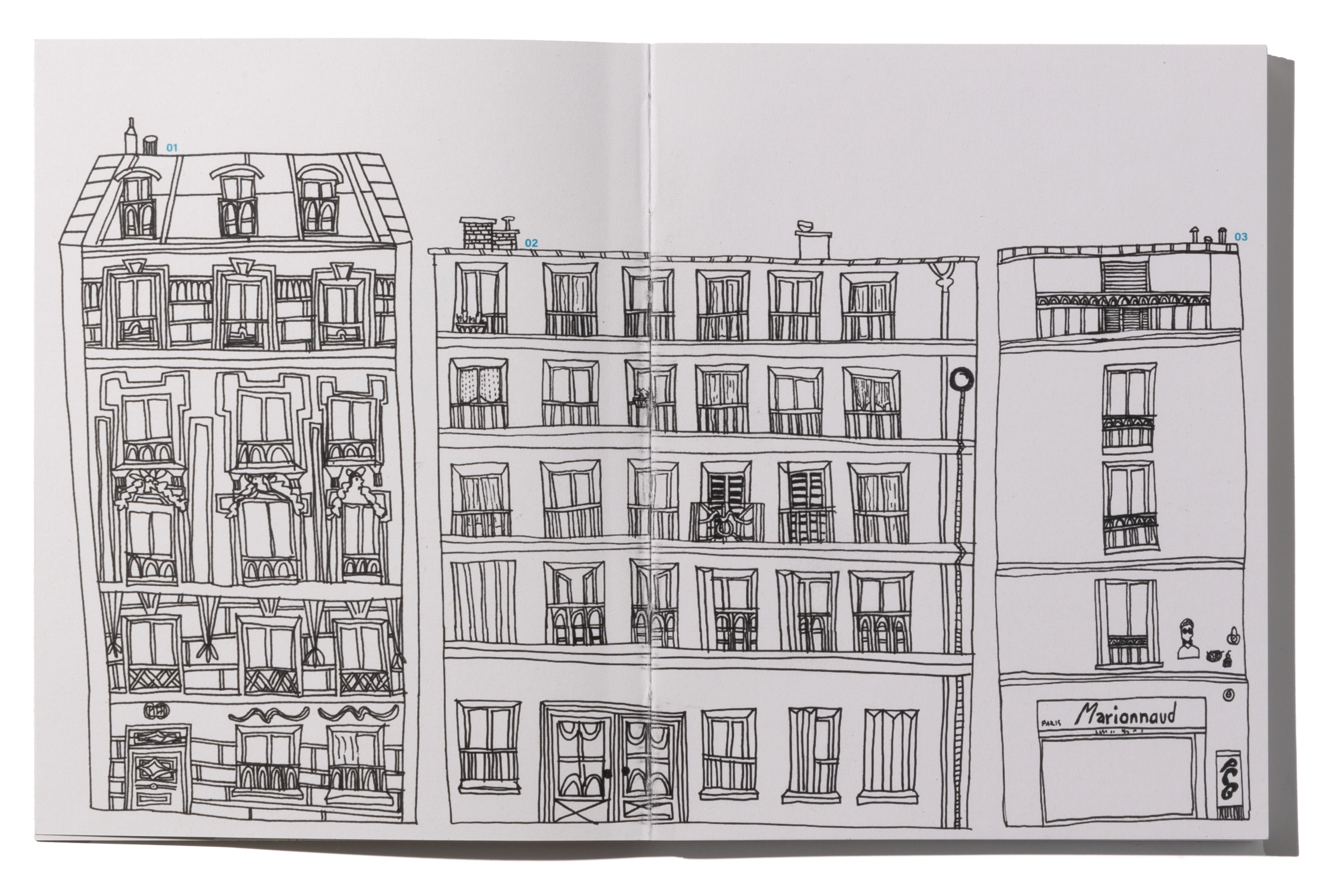 During my time in Paris, I dealt with the quarter around the Canal Saint Martin. What makes this neighborhood special, what is the architecture like, where do you eat, where do you live? I explored this in my drawings and illustrations. I drew directly in my sketchbook with fineliner and without sketching, with a lot of courage. I then organized the many drawings into several categories. Each category became a chapter, for example windows and doors or stores. All chapters have a color assigned to them, which marks them and serves as a guide. This can be seen on the open back of the book I bound myself.